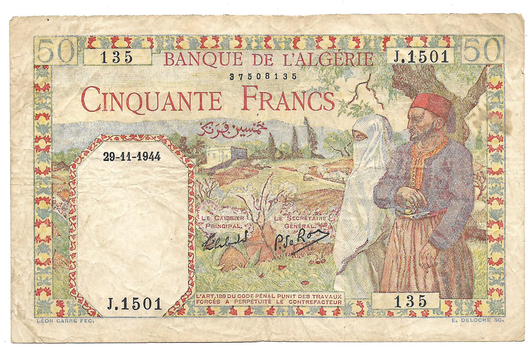 Argelia Colonia Francesa 50 Francos 29-11-1944 P87 MB+
