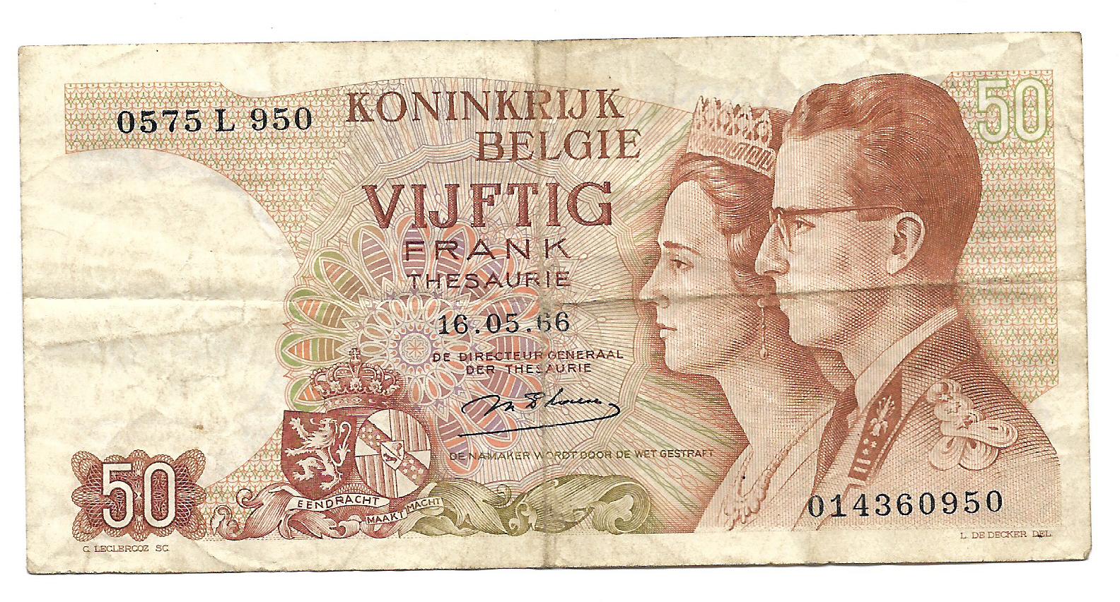 Belgica 50 Francos 1966 P139 MB- cantidad