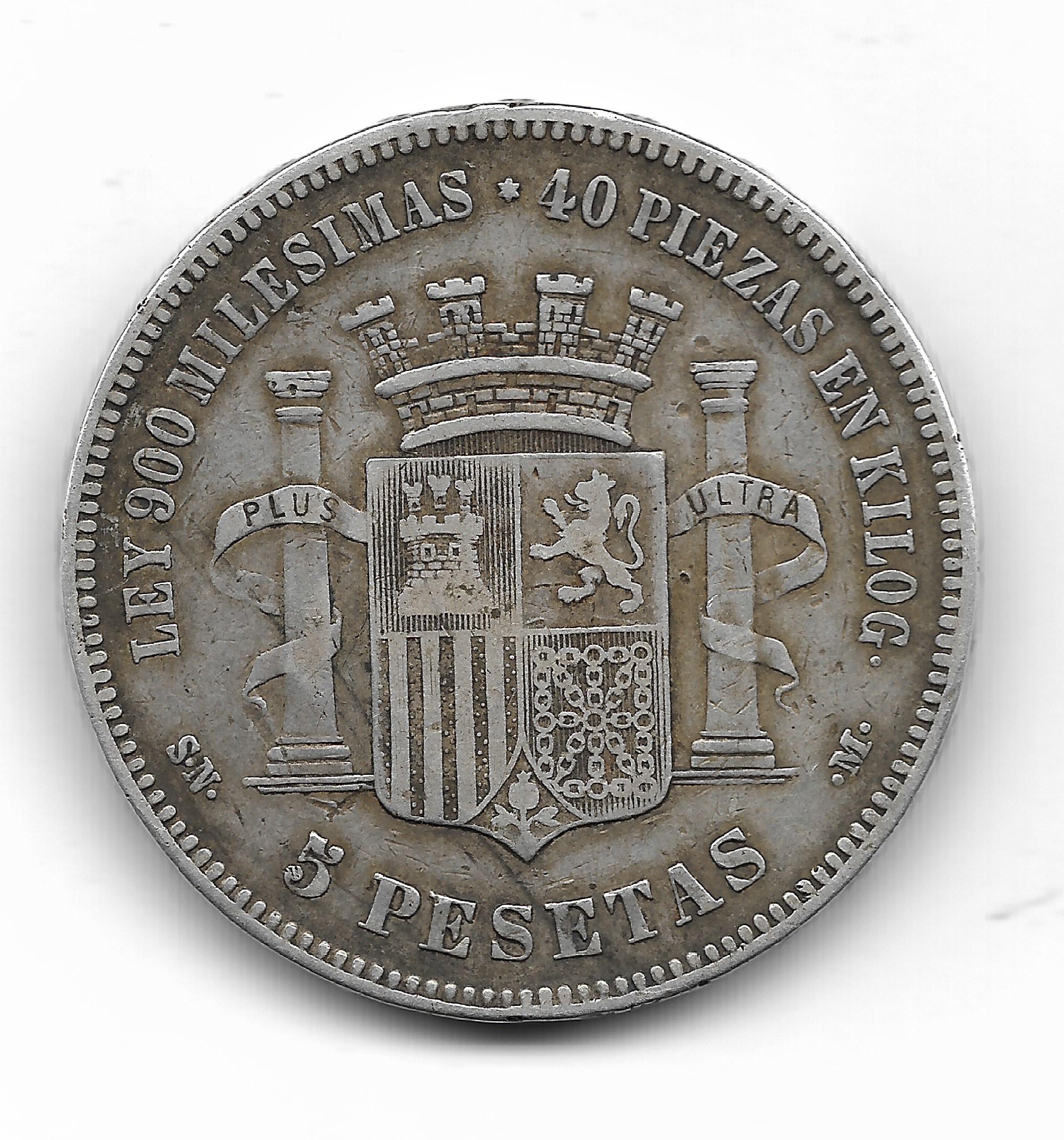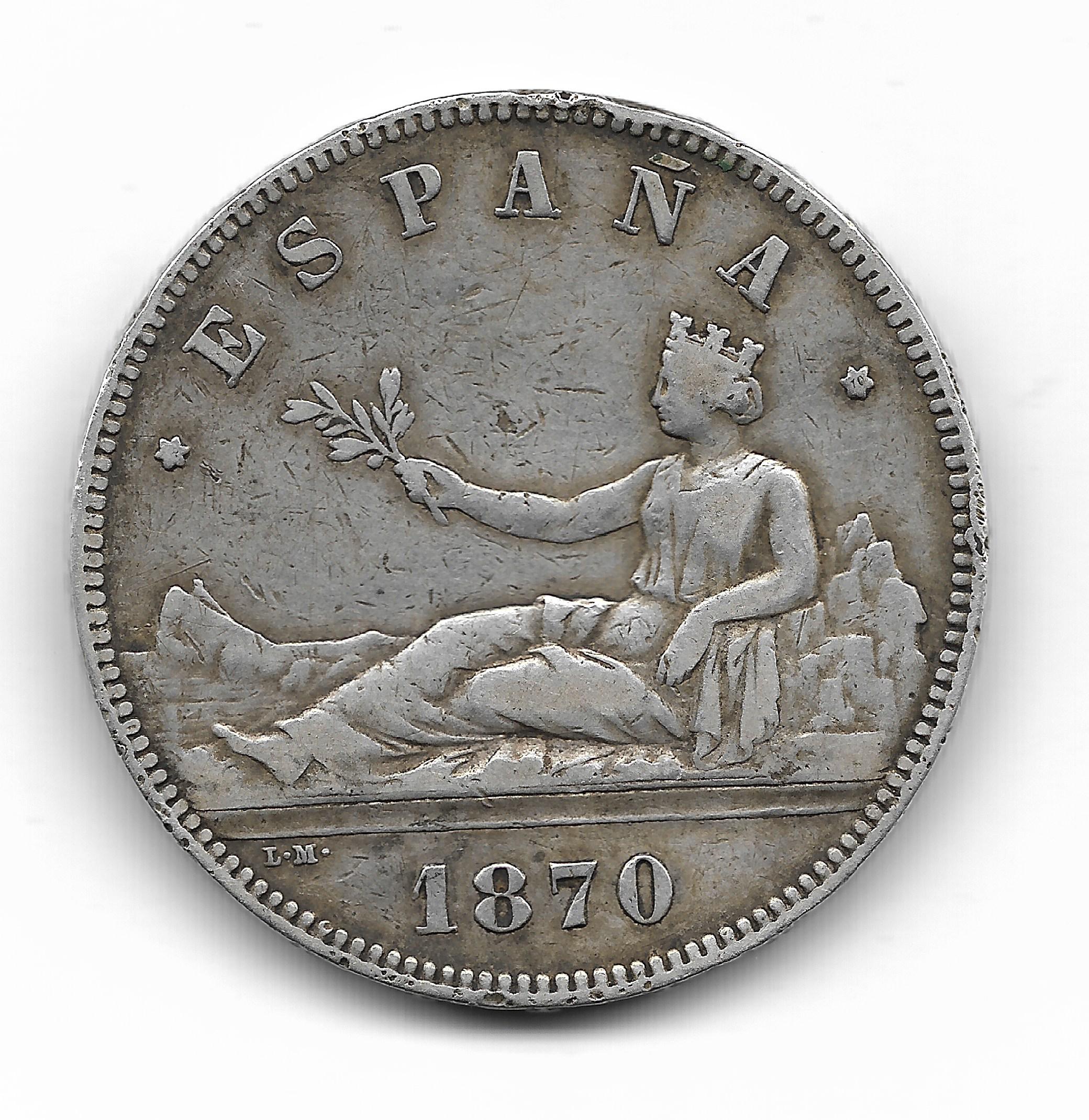 España 5 Pesetas de Plata 1870 *70 KM655 MB+