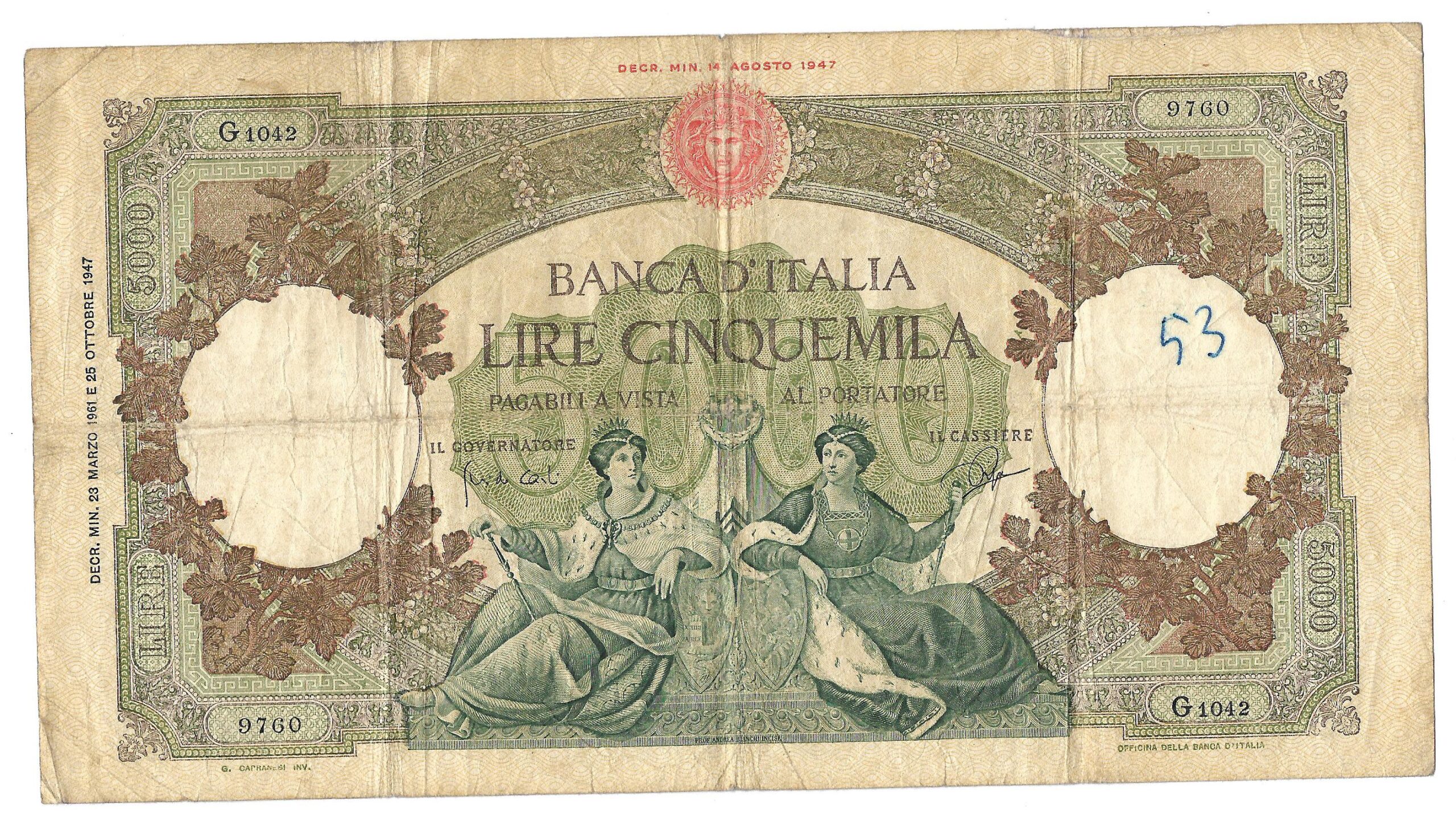 Italia 5000 Liras 23-3-1961 P85d MB-
